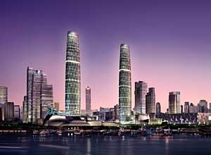 | 廣州新城市中心珠江新城地標(biāo)性建筑“雙塔”的建筑效果圖。攝影/本報(bào)記者