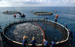 三亞市海域的大型深海網(wǎng)箱養(yǎng)殖場(chǎng)。本報(bào)記者:姜恩宇 攝