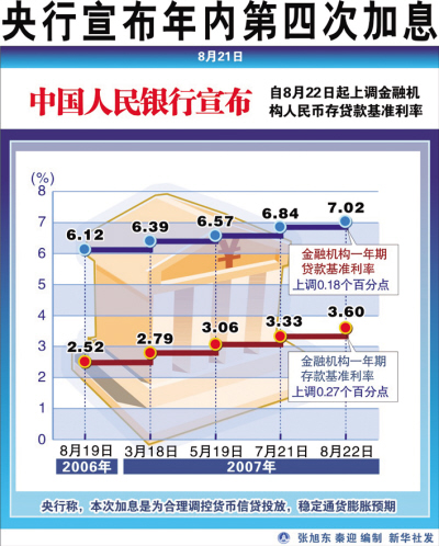 中國(guó)人民銀行21日晚間宣布,自22日起一年期存貸款基準(zhǔn)利率分別上調(diào)0.27和.18?jìng)(gè)百分點(diǎn)。個(gè)人住房公積金貸款利率相應(yīng)上調(diào)0.09個(gè)百分點(diǎn)。這是央行本年內(nèi)第4次加息。
