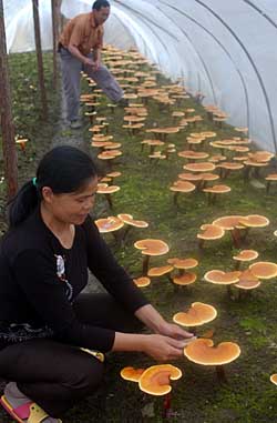 農民在大棚里種植靈芝。 | 江西是一個傳統(tǒng)農業(yè)省份,工業(yè)經濟相對落后,山青水綠,生態(tài)優(yōu)勢非常顯著。進入新世紀以來,江西審時度勢,按照科學發(fā)展觀的要求,提出了