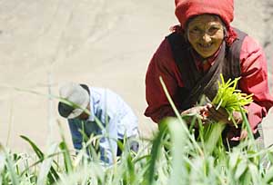 | 西藏山南地區(qū)乃東縣的農(nóng)民喜收蒜苔,當(dāng)?shù)卣M(jìn)行農(nóng)業(yè)結(jié)構(gòu)調(diào)整取得明顯成果。 | 在湍急水流的沖擊下,西藏白朗縣貴熱村的廠房里的四臺水磨發(fā)出了隆隆的轟鳴聲,旋舞的磨盤下,細(xì)密的糌粑向雪花一樣落入收集槽里。已經(jīng)在這個名為康桑農(nóng)產(chǎn)品加工廠里工作兩年多的達(dá)娃頓珠說:“一個磨盤一天一夜可以磨一千斤糌粑,產(chǎn)品銷路非常好,除了拉薩、日喀則,還賣到了尼泊爾! 眼下,像康桑這樣的特色農(nóng)產(chǎn)品加工企業(yè)正在西藏不少地區(qū)蓬勃興起,成為當(dāng)?shù)剞r(nóng)村、農(nóng)業(yè)經(jīng)濟(jì)增長的新亮點。西藏自治區(qū)人大常委會副主任洛桑頓珠說,充分利用生態(tài)條件,將環(huán)保和經(jīng)濟(jì)發(fā)展相結(jié)合,是雪域高原特色農(nóng)業(yè)發(fā)展的必經(jīng)之路。