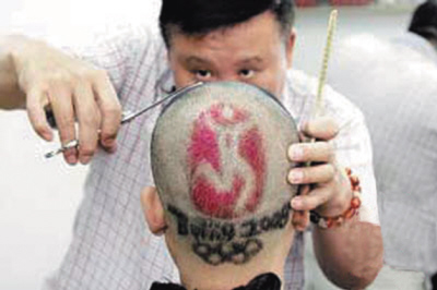 發(fā)型師是走在時(shí)尚最前沿的人,他們不僅自己喜歡留創(chuàng)新發(fā)型,也不斷地為顧客打造新式時(shí)尚的發(fā)型。前期,已有不少令人眼前一亮的奧運(yùn)發(fā)型宣傳者。近日,在天津河北區(qū)一家理發(fā)店內(nèi),就有一位市民在頭頂上留下了“北京2008”字樣和奧運(yùn)五環(huán)標(biāo)志。他表示希望通過(guò)這種方式提醒大家,奧運(yùn)會(huì)離我們很近了。另一位典范是年輕實(shí)力派歌手、國(guó)家一級(jí)演員春燕,她在演唱歌曲《新北京》時(shí)以紅、綠、藍(lán)、黃、黑色的五環(huán)發(fā)髻亮相吸引了不少人的眼球。而且,奧運(yùn)舉行期間,一些渲染氣氛的彩色怪異的發(fā)型也將悉數(shù)登場(chǎng)。這樣的情景實(shí)在令人期待,不過(guò),屆時(shí),有創(chuàng)意的發(fā)型師將累得腳不沾地。