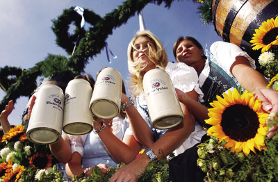 第一百七十四屆慕尼黑啤酒節(jié)日前在德國巴伐利亞州慕尼黑開幕。德國慕尼黑啤酒節(jié)享譽(yù)世界,從每年9月的第三個星期六開始,到10月的第一個星期日結(jié)束。圖為幾名女服務(wù)員身穿巴伐利亞傳統(tǒng)服裝參加慕尼黑啤酒節(jié)開幕游行。