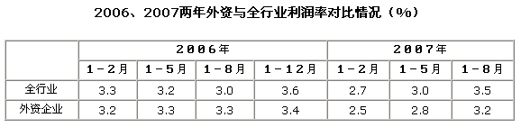 1.外資企業(yè)利潤率低于全行業(yè)平均水平。1-8月外資企業(yè)實(shí)現(xiàn)659.5億元,同比增長15%,低于全行業(yè)平均增速10.6個(gè)百分點(diǎn),占全行業(yè)比重71.5%,比1-5月的75.3%下降3.8個(gè)百分點(diǎn)。自去年年底以來外資企業(yè)利潤率開始低于全行業(yè)利潤率水平,從今年2月、5月、8月數(shù)據(jù)看,這種局面不但沒有得到改善,反而有逐步擴(kuò)大的趨勢(shì)。
