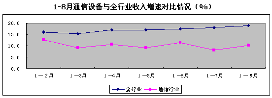 通信設(shè)備制造業(yè)發(fā)展明顯放緩。今年以來,通信設(shè)備制造業(yè)發(fā)展速度始終低于全行業(yè)平均水平,收入增速一直在10%左右浮動(dòng),比同期水平低近30個(gè)百分點(diǎn),總量規(guī)模也不斷萎縮,從4月份開始退居小行業(yè)第三。到本月收入占全行業(yè)比重17.4%,比同期低1.3個(gè)百分點(diǎn)。這主要是由于移動(dòng)通信終端及設(shè)備制造行業(yè)收入增速從去年同期的41.9%下降到本月的4.4%。