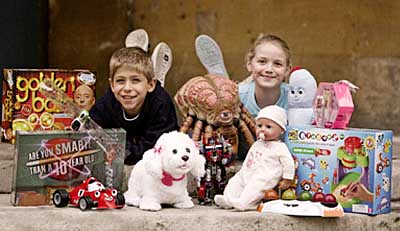 10月10日,英國玩具零售商協(xié)會前公布了該協(xié)會預測的2007年圣誕節(jié)12種熱門玩具。圖為在英國首都倫敦,兩名兒童和被選出的12種熱門玩具合影。