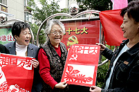 | 北京朝陽區(qū)六里屯街道退休老教師孫慧敏(左二)現(xiàn)場展示紙剪作品“ 喜迎十七大”和“祖國萬歲”,表達(dá)迎接十七大的喜悅心情。 |