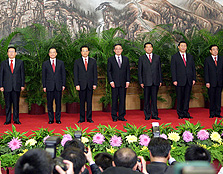 剛剛在黨的十七屆一中全會(huì)上當(dāng)選的中共中央總書(shū)記胡錦濤和中央政治局常委吳邦國(guó)、溫家寶、賈慶林、李長(zhǎng)春、習(xí)近平、李克強(qiáng)、賀國(guó)強(qiáng)、周永康,22日上午在人民大會(huì)堂同采訪黨的十七大的中外記者親切見(jiàn)面。 人民大會(huì)堂東大廳華燈璀璨,鮮花綻放,氣氛熱烈莊重。600多名中外記者早早來(lái)到這里。他們架起一排排攝像機(jī)、照相機(jī),手持錄音機(jī)、采訪本,等待著新一屆中共中央政治局常委會(huì)組成人員的到來(lái)。[詳情] | |