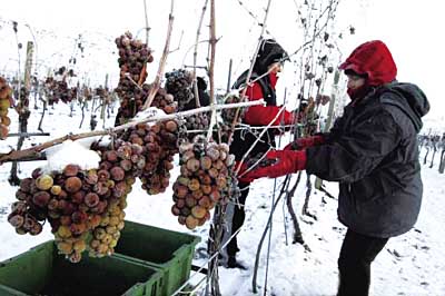 通常每年11月到12月是人們摘取冰葡萄的時機。用冰葡萄釀出的酒糖分較多,味道獨特,被人們稱為“冰葡萄酒”。圖為葡萄酒公司工人在捷克東南部小城布羅德納德第伊摘冰葡萄。