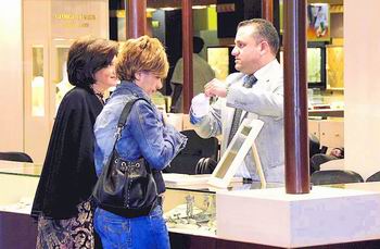 第十五屆阿布扎比國際珠寶鐘表展日前在阿聯(lián)酋首都阿布扎比國際會展中心拉開帷幕。在為期5天的展會期間,來自16個國家和地區(qū)的110余家著名珠寶鐘表制造商將向觀眾集中展示2007年珠寶鐘表行業(yè)的最新加工工藝及款式流行趨勢。本次參展珠寶商品在設(shè)計(jì)上強(qiáng)調(diào)傳統(tǒng)與現(xiàn)代的融合,廣泛使用鏤空、噴砂工藝,并在此基礎(chǔ)上更加突顯飾品的奢華感。據(jù)展會主辦方透露,全部參展珠寶總價值高達(dá)41億美元,為歷屆展會之冠。阿布扎比國際珠寶鐘表展創(chuàng)辦于1992年,每年舉辦一屆,是中東地區(qū)規(guī)模最大、檔次最高的珠寶鐘表博覽會之一。阿聯(lián)酋是全球珠寶消費(fèi)最旺盛的國家,2006年各類黃金、珠寶、鉆石進(jìn)口總額超過82億美元,人均黃金消費(fèi)量高達(dá)23克。圖為參觀者在一家創(chuàng)立于1875年的歐洲知名珠寶老店展柜前選購商品。 | |