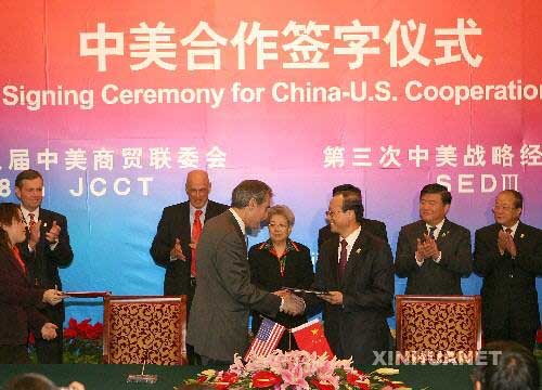 12月11日,中國國家旅游局局長邵琪偉與美國商務(wù)部長古鐵雷斯在北京正式簽署《中華人民共和國政府與美利堅(jiān)合眾國政府關(guān)于便利中國旅游團(tuán)隊(duì)赴美利堅(jiān)合眾國旅游的諒解備忘錄》。當(dāng)日,中美雙方在北京釣魚臺國賓館舉行中美經(jīng)貿(mào)合作簽字儀式,簽署了14個協(xié)議和備忘錄。國務(wù)院副總理吳儀和美國財(cái)政部長保爾森、商務(wù)部長古鐵雷斯、衛(wèi)生部長萊維特等出席了簽字儀式。新華社記者