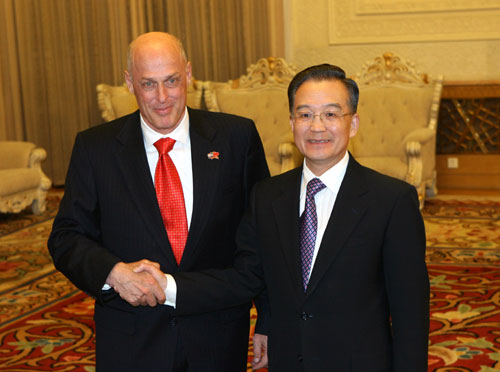 國務院總理溫家寶13日在人民大會堂會見了出席第三次中美戰(zhàn)略經濟對話的美國總統布什的特別代表、財政部長保爾森等美方代表團主要成員。