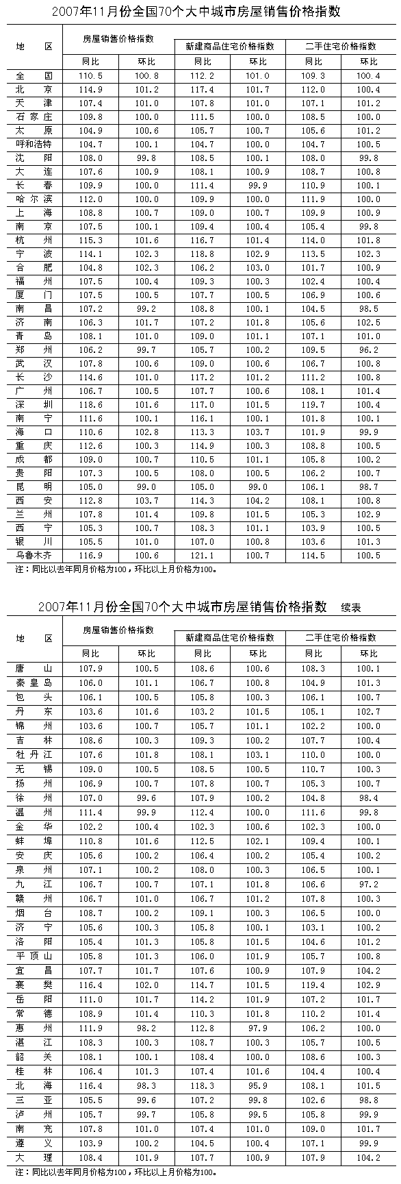 據(jù)國家發(fā)展改革委、國家統(tǒng)計局調(diào)查顯示,2007年11月,全國70個大中城市房屋銷售價格同比上漲10.5%,漲幅比上月高1.0個百分點;環(huán)比上漲0.8%,漲幅比上月低0.8個百分點。