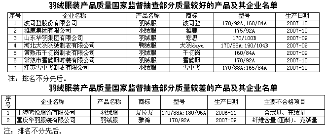 此次抽查依據(jù)GB5296.4-1998《消費(fèi)品使用說(shuō)明紡織品和服裝使用說(shuō)明》、GB18401-2003《國(guó)家紡織產(chǎn)品基本安全技術(shù)規(guī)范》、GB/T14272-2002《羽絨服裝》、FZ/T01053-2007《紡織品