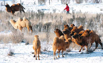 近幾年,新疆阿勒泰地區(qū)哈薩克族牧民中興起經(jīng)營駱駝奶的熱潮,生意十分紅火。圖為布爾津縣窩依莫克鄉(xiāng)哈臺(tái)村哈薩克族牧民在趕駱駝。