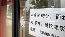 | 1月8日,杭州市鬧市區(qū)的一個房產(chǎn)中介公司打出了轉(zhuǎn)讓店面廣告。隨著近期二手房地產(chǎn)市場遇冷,一些規(guī)模小的房產(chǎn)中介紛紛退掉位于鬧市區(qū)的店面,轉(zhuǎn)而尋找成本更低的地段另謀發(fā)展。 |
