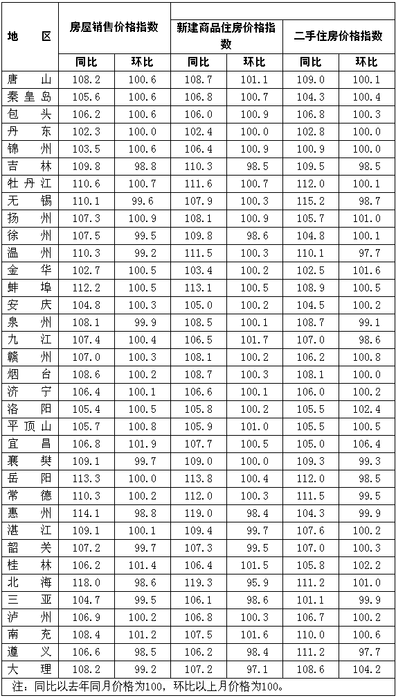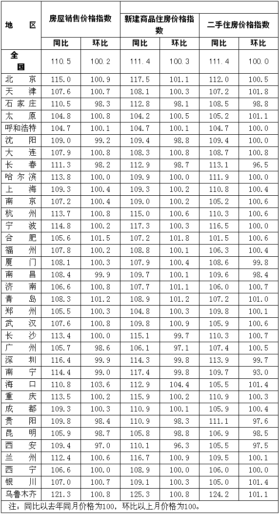 一、新建商品住房銷售價格同比上漲11.4%,漲幅比上月低0.8個百分點;環(huán)比上漲0.3%,漲幅比上月低0.7個百分點。分類別看,經(jīng)濟適用房、普通住房和高檔住房銷售價格同比分別上漲3.9%、12.1%和11.8%,環(huán)比分別上漲0.0%、0.3%和0.2%。分地區(qū)看,同比漲幅較高的主要城市包括:烏魯木齊25.3%、北海19.3%、惠州19.0%、北京17.5%、南寧17.4%、寧波17.3%、蘭州16.7%、重慶15.9%和長沙15.1%等;環(huán)比漲幅較高的主要城市包括:?
