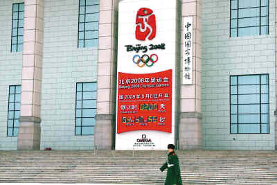 中國國家博物館門前的2008年奧運(yùn)會(huì)倒計(jì)時(shí)牌顯示距北京奧運(yùn)會(huì)開幕還有200天。 新華社記者 高學(xué)余