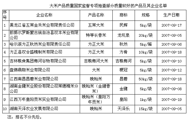 此次抽查依據(jù)GB1354-1986《大米》、GB2715-2005《糧食衛(wèi)生標(biāo)準(zhǔn)》、GB7718-2004《預(yù)包裝食品標(biāo)簽通則》等強(qiáng)制性國家標(biāo)準(zhǔn)規(guī)定的要求,對大米產(chǎn)品的黃粒米、水分、鉛、無機(jī)砷、汞、鎘、六六六、滴滴涕、馬拉硫磷、殺蟲雙、殺螟硫磷、稻瘟靈、丁草胺、黃曲霉毒素B1以及標(biāo)簽等15個項目進(jìn)行了檢驗。經(jīng)檢驗,涉及人體健康的主要安全項目黃曲霉毒素B1、重金屬含量、農(nóng)藥殘留等指標(biāo)全部符合國家標(biāo)準(zhǔn)規(guī)定的要求。