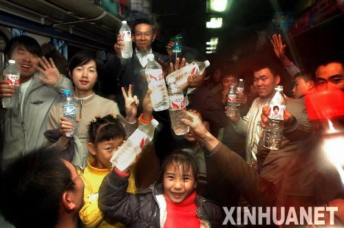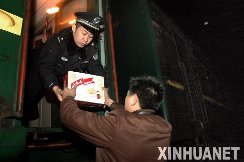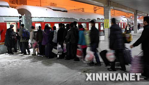 1月28日,在合肥火車站,旅客在排隊上車。 當日凌晨3點,由合肥開往成都1432/1433次列車,因大雪晚點4小時后進入站臺,記者隨旅客隊伍一起登上這趟列車,一線感受春運。開車后,各車廂列車員為旅客及時供應開水,廣播員多次為列車晚點向旅客致歉,列車長和乘警走進硬座車廂檢查“三品”。車廂外天寒地凍,車廂內暖意融融。新華社記者 陶明 攝