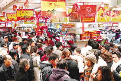 | 春節(jié)臨近,上海市民采購年貨進(jìn)入高峰,滬上食品商店人流如潮 | 隨著新春佳節(jié)的日漸臨近,市場已是一派喜氣洋洋。然而,近日的一場大雪拉升了滬上本已平穩(wěn)的菜價(jià)。而與此形成鮮明對比的是,果市雖已進(jìn)入一年當(dāng)中最為旺銷的時(shí)候,也遭受到了暴風(fēng)雪的洗禮,由于品種多、質(zhì)量好、數(shù)量充足等,市場供應(yīng)基本正常,果價(jià)起伏不大,價(jià)格也并不貴。據(jù)上海果品行業(yè)協(xié)會信息披露,今年春節(jié)前后的24天時(shí)間里,申城水果供應(yīng)總量在15萬噸以上,其中蘋果、柑桔類約占