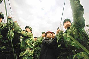 2月16日,支援江西贛州定南線路搶修的南京軍區(qū)某部官兵,得知當地最困難的高沙塘、上蔡兩個村民小組尚未恢復通電的消息,主動請戰(zhàn)開赴現(xiàn)場,通過兩天的艱苦奮戰(zhàn),定南農村電網全面恢復供電。圖為官兵們在高沙塘拉線。熊義詔/攝 |