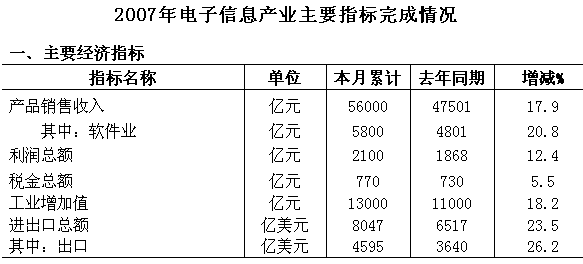 2007年,電子信息全行業(yè)在黨中央、國務(wù)院的正確領(lǐng)導(dǎo)下,堅(jiān)持以科學(xué)發(fā)展觀為指導(dǎo),認(rèn)真貫徹落實(shí)國家戰(zhàn)略部署和宏觀調(diào)控措施,積極應(yīng)對(duì)技術(shù)業(yè)務(wù)轉(zhuǎn)型升級(jí)和宏觀政策環(huán)境變化的新形勢(shì),不斷推動(dòng)結(jié)構(gòu)調(diào)整和自主創(chuàng)新,積極拓展國內(nèi)外市場(chǎng),使產(chǎn)業(yè)經(jīng)濟(jì)運(yùn)行呈現(xiàn)平穩(wěn)發(fā)展態(tài)勢(shì),為國民經(jīng)濟(jì)和社會(huì)發(fā)展做出了新的貢獻(xiàn)。
