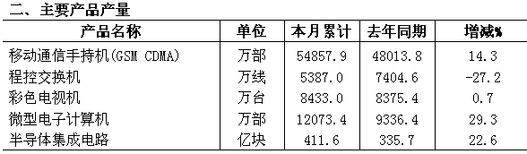 。ㄒ唬┊a(chǎn)業(yè)規(guī)模不斷擴(kuò)大 全年實(shí)現(xiàn)銷售收入5.6萬億元,增長18%;增加值13000億元,增長18.2%;軟件業(yè)務(wù)收入5800億元,增長20.8%。產(chǎn)業(yè)規(guī)模繼續(xù)在國民經(jīng)濟(jì)各行業(yè)中位居領(lǐng)先,銷售收入占全國工業(yè)的比重為12%,增加值占全國GDP的比重達(dá)5.27%。 (二)經(jīng)濟(jì)效益穩(wěn)步提高 進(jìn)入二季度后,全行業(yè)經(jīng)濟(jì)效益開始扭轉(zhuǎn)負(fù)增長的局面,至12月底實(shí)現(xiàn)利稅2870億元。其中實(shí)現(xiàn)利潤2100億元,增長12.4%;稅收770億元,增長5.5%;二者增速比上半年提高2個(gè)百分點(diǎn)以上。計(jì)算機(jī)、家用視聽設(shè)備和電子器件行業(yè)效益情況較好,利潤增速達(dá)20%以上,成為拉動(dòng)全行業(yè)效益增長的主要力量。 。ㄈ┊a(chǎn)品產(chǎn)銷銜接良好 多數(shù)重點(diǎn)產(chǎn)品產(chǎn)量保持平穩(wěn)增長,全年生產(chǎn)手機(jī)5.48億部,增長14%;微型計(jì)算機(jī)1.21億臺(tái),增長29%;數(shù)碼相機(jī)7493.5萬臺(tái),增長11.9%;集成電路產(chǎn)量412億塊,增長22.6%;彩色電視機(jī)8433萬臺(tái),增長0.7%。產(chǎn)品產(chǎn)銷銜接良好,手機(jī)、計(jì)算機(jī)、彩電等主要產(chǎn)品產(chǎn)銷率均達(dá)98%以上。全行業(yè)產(chǎn)品庫存慢于收入增長,增速為17%,比收入增速低了1個(gè)百分點(diǎn)。 。ㄋ模⿲(duì)外貿(mào)易增勢(shì)平穩(wěn) 全行業(yè)對(duì)外貿(mào)易額達(dá)到8047億美元,同比增長23.5%,占全國外貿(mào)總額的37%。出口4595億美元,增長26.2%,增速比全國出口高了0.5個(gè)百分點(diǎn),占全國出口總額的比重為37.7%。進(jìn)口3452億美元,增長20%,占全國進(jìn)口總額的比重為36.1%。出口較快的主要是計(jì)算機(jī)和電子元件行業(yè),二者增速分別比全行業(yè)高了2.8和10.8個(gè)百分點(diǎn)。 。ㄎ澹┕潭ㄙY產(chǎn)投資繼續(xù)擴(kuò)大 全行業(yè)500萬元以上投資項(xiàng)目累計(jì)完成投資2646億元,同比增長27.9%;本年新增固定資產(chǎn)1477億元,增長9.2%。本年新開工項(xiàng)目2780個(gè),同比增長10.2%;新開工項(xiàng)目的計(jì)劃投資總額為2303億元,增長34.9%;新開工項(xiàng)目主要來自電子元器件領(lǐng)域,二者新開工項(xiàng)目超過1300項(xiàng),占全行業(yè)的一半左右。 。┢髽I(yè)實(shí)力不斷增強(qiáng) 全行業(yè)規(guī)模以上企業(yè)共有27569家,其中制造業(yè)14601家,軟件業(yè)12968家。企業(yè)經(jīng)濟(jì)規(guī)模不斷擴(kuò)大,全年電子信息百強(qiáng)企業(yè)完成營業(yè)收入超過1萬億元,實(shí)現(xiàn)利稅超過500億元,出口交貨值增長20%以上,日益成為推動(dòng)行業(yè)平穩(wěn)運(yùn)行的中堅(jiān)力量。 (七)科技創(chuàng)新日趨深入 新品開發(fā)穩(wěn)步增長,全行業(yè)新品產(chǎn)值率超過20%,比上年提高了0.2個(gè)百分點(diǎn)。企業(yè)研發(fā)投入不斷提高,全行業(yè)研發(fā)投入超過1000億元,電子信息百強(qiáng)企業(yè)研發(fā)投入占銷售收入比重接近4%,其中有11家企業(yè)比例已超過6%,海爾、華為等研發(fā)投入均超過50億元。 。ò耍﹨^(qū)域布局日益集中 九個(gè)國家信息產(chǎn)業(yè)基地實(shí)現(xiàn)收入超過3萬億元,成為引領(lǐng)產(chǎn)業(yè)增長的重要地區(qū),并在結(jié)構(gòu)調(diào)整、技術(shù)創(chuàng)新、產(chǎn)業(yè)配套、外貿(mào)出口、人才就業(yè)等方面發(fā)揮重要的帶動(dòng)示范效應(yīng)。40個(gè)國家電子信息產(chǎn)業(yè)園,分別在通信、計(jì)算機(jī)、家電、集成電路、電子元件、電子器件、電子材料等專業(yè)領(lǐng)域處于全國領(lǐng)先地位,合計(jì)產(chǎn)業(yè)規(guī)模占全國的1/4以上。 。ň牛┠茉聪奶幱谳^低水平 全年規(guī)模以上制造業(yè)消耗標(biāo)準(zhǔn)煤1476萬噸,每萬元增加值消耗標(biāo)準(zhǔn)煤0.164噸,比上年下降1.2%,約等于國民經(jīng)濟(jì)和工業(yè)平均水平的15%和7%。其中能耗排在前面的小行業(yè)分別是電子真空器件(1.13噸)、電光源(0.61噸)、印制電路板(0.38噸)、信息化學(xué)材料(0.37噸)、光纖光纜(0.36噸)。從能源產(chǎn)品看,電力、原煤、燃料油、柴油占據(jù)前四位,分別占全行業(yè)能源消耗量的49%、15%、11%、10%。 (十)信息化程度進(jìn)一步提高 全國手機(jī)普及率達(dá)到41.6%,比上年增加了6.3個(gè)百分點(diǎn);互聯(lián)網(wǎng)用戶達(dá)到2.1億人,比上年增長7000萬人以上;城鎮(zhèn)居民計(jì)算機(jī)擁有量達(dá)到59.7臺(tái)/百戶,彩電擁有量超過151臺(tái)/百戶,二者分別比上年提高了15%和5%。國家信息化投資占城市基礎(chǔ)設(shè)施投資的比重接近10%,電子政務(wù)投入在電信建設(shè)投入的比重為12%。企業(yè)電子商務(wù)不斷推進(jìn),電子大中型企業(yè)電子商務(wù)采購、銷售額占營業(yè)額的比重達(dá)40%。 (十一)從業(yè)人數(shù)不斷增加 全年規(guī)模以上電子信息產(chǎn)業(yè)就業(yè)人數(shù)達(dá)到777萬人,其中制造業(yè)675萬人,軟件業(yè)102萬人;二者合計(jì)比上年增加了53萬人,占全國城鎮(zhèn)新增就業(yè)人數(shù)的5%,其中制造業(yè)新增就業(yè)人數(shù)占全國工業(yè)的比重為10%。 。ㄊ┊a(chǎn)品價(jià)格呈下降趨勢(shì) 2007年,我國主要消費(fèi)類電子產(chǎn)品價(jià)格指數(shù)為85.2,降幅較上年增