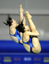 3月23日,郭晶晶(右)吳敏霞在安徽合肥舉行的2008年全國跳水冠軍賽暨奧運會選拔賽(雙人)女子雙人3米板決賽中,以348.00分的成績奪得金牌。新華社記者:李健 攝