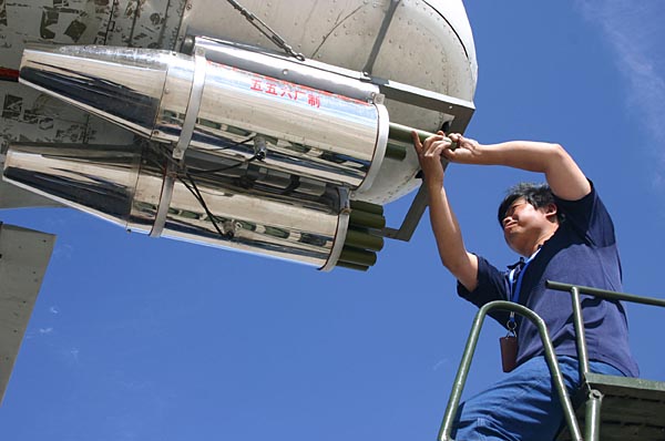 圖為2007年8月8日,工作人員為“運8”飛機安裝催化材料。為保障2008年奧運會開、閉幕式順利舉行,北京、內(nèi)蒙古氣象部門于2007年8月8日至9日聯(lián)合在呼和浩特進行2008年奧運會“消云減雨”演練。(資料照片) |