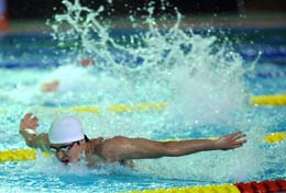 2008年全國(guó)游泳冠軍賽暨奧運(yùn)選拔賽上,吳鵬在男子100米蝶泳預(yù)賽中。新華社記者:徐昱