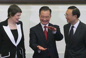 | 中國(guó)國(guó)務(wù)院總理溫家寶(中)、新西蘭總理克拉克(左)、中國(guó)外交部部長(zhǎng)楊潔篪(右)出席簽字儀式。新華/路透圖 | 《中國(guó)政府和新西蘭政府自由貿(mào)易協(xié)定》昨天(4月7日)正式簽署。這是中國(guó)與其他國(guó)家簽署的第一個(gè)全面的自由貿(mào)易協(xié)定,也是我國(guó)與發(fā)達(dá)國(guó)家達(dá)成的第一個(gè)自由貿(mào)易協(xié)定。