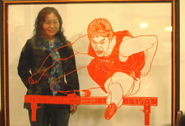 “中國(guó)人的驕傲”剪紙藝術(shù)巡展首站在香港中央圖書館啟動(dòng),展出近200幅以奧運(yùn)為主題的剪紙作品。圖為“中國(guó)人的驕傲——永恒瞬間”創(chuàng)作人盧雪和她的作品《劉翔》合影。 |