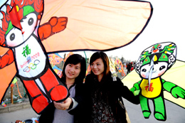 兩位姑娘在漢中市橋北廣場(chǎng)選購(gòu)制作精美的福娃風(fēng)箏。