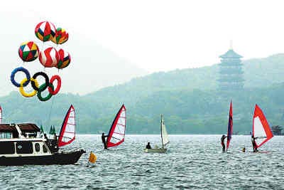 4月8日,“百舸競春,西湖船會”在杭州西湖舉行。上百只各式西湖游船沿著桃紅柳綠的西湖岸邊一路巡游,其間還進行了賽艇、皮劃艇競技表演等多項活動。圖為專業(yè)賽艇、皮劃艇在進行競技表演。