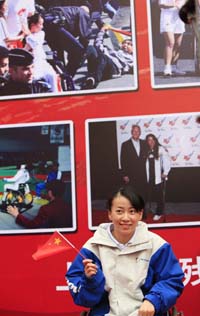 4月13日,在巴黎火炬?zhèn)鬟f活動中全力保護奧運火炬的中國殘疾人運動員金晶從北京回到家鄉(xiāng)上海。圖為金晶在歡迎儀式上留影。