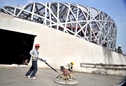 4月11日,工人在國家體育場(“鳥巢”)施工!昂眠\北京”國際田徑競走挑戰(zhàn)賽4月18日至19日將在國家體育場(“鳥巢”)舉行,這將是國家體育場第一次公開亮相,“鳥巢”也將迎來首批參賽運動員和觀眾。