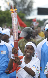 4月13日,坦桑尼亞火炬手穆絲塔法·妲米麗手持火炬?zhèn)鬟f。23歲的坦桑尼亞女孩穆絲塔法·妲米麗是參加北京奧運火炬在達累斯薩拉姆傳遞活動的火炬手中惟一一位艾滋病病毒攜帶者。