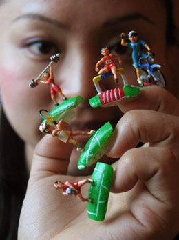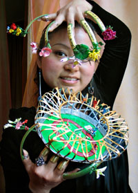 日前,南京美甲造型師金玉耗時兩個多月設計創(chuàng)作了一組奧運主題美甲作品。這組作品共有20多件,用水晶粉等美甲材料制成,包括福娃、可活動的體育人物、奧運場館等系列。圖為金玉在展示“奧運美甲”作品。 |