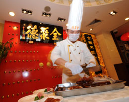 全聚德亞運(yùn)村店的廚師在展示片鴨子的技術(shù)。本報記者:李鋼