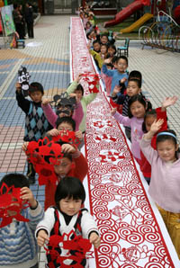 蘇州市滄浪區(qū)南門街道紅旗幼兒園日前舉辦了“百名幼兒迎奧運”活動,民間剪紙藝人金國榮展示了自己歷時半年創(chuàng)作的一幅長2008厘米的奧運剪紙長卷,長卷上共有43個福娃造型。