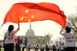 4月19日,300多名美國華僑華人和中國留學(xué)生以及部分美國民眾在美國首都華盛頓國會山前舉行集會,支持北京奧運會,并抗議一些西方媒體對中國西藏問題和奧運火炬?zhèn)鬟f進行的歪曲報道。