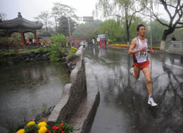 4月20日,亞軍獲得者中國選手李柱宏在北京大學(xué)校園里奔跑。當(dāng)日,“好運北京”2008年北京國際馬拉松賽在雨中舉行,李柱宏以2小時15分32秒的成績奪得男子組亞軍。 |