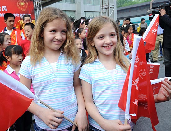 4月19日,百對(duì)雙胞胎“迎奧運(yùn)、講文明、樹(shù)新風(fēng),爭(zhēng)做好市民從我做起”活動(dòng)在天津舉行。圖為一對(duì)來(lái)自英國(guó)的8歲雙胞胎姐妹在活動(dòng)上。