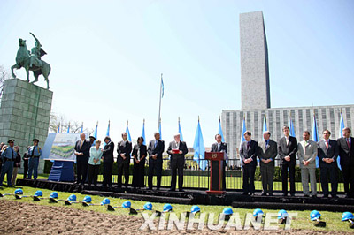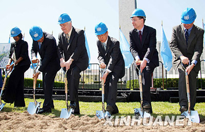 5月5日,在美國紐約聯(lián)合國總部北草坪,聯(lián)合國秘書長潘基文(右三)在奠基儀式上鏟土。 |