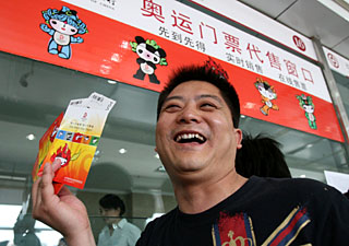 | 5月5日,阜陽(yáng)市民在中國(guó)銀行阜陽(yáng)支行奧運(yùn)門(mén)票代售點(diǎn)展示自己購(gòu)買(mǎi)的奧運(yùn)門(mén)票。新華社發(fā)(戴文學(xué)