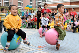 各種形式的趣味運(yùn)動(dòng)會(huì)近日在福州市的社區(qū)陸續(xù)展開,人們以歡快活潑的趣味比賽迎奧運(yùn)。圖為福州金山吉龍社區(qū)的小朋友在社區(qū)趣味運(yùn)動(dòng)會(huì)中進(jìn)行跳球接力比賽。