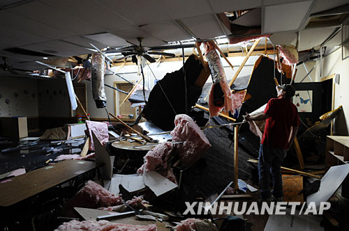 5月10日,在美國阿肯色州本頓維爾,一名男子查看一所學校受損的屋頂。新華社/美聯(lián)