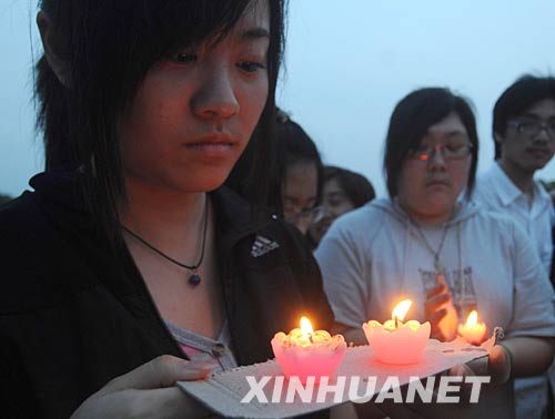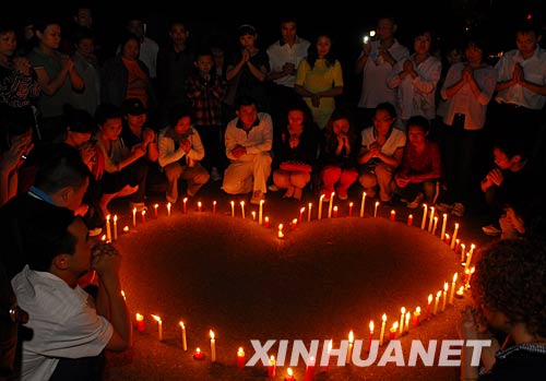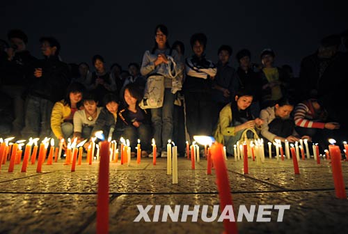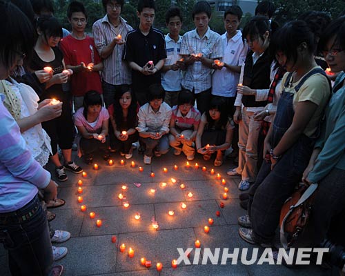 當(dāng)日,一些浙江工業(yè)大學(xué)學(xué)生在校內(nèi)舉行燭光祈;顒,用這種方式表達(dá)對地震災(zāi)區(qū)人民的牽掛,希望災(zāi)區(qū)人民早日渡過難關(guān)。 新華社記者 徐昱 攝