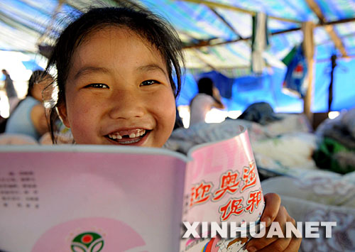 5月18日,四川青川縣喬莊鎮(zhèn)學(xué)生慧文在帳篷里閱讀有關(guān)奧運的書籍。她盼望地震不要影響了她看北京奧運會的電視實況。